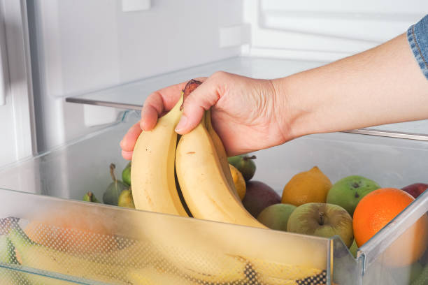 Woman getting fresh bananas from a fridge. Close up.